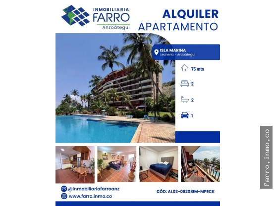 𝗔𝗟𝗤𝗨𝗜𝗟𝗔 hermoso y acogedor apartamento de 75 m2, en el 𝗖𝗼𝗻𝗷𝘂𝗻𝘁𝗼 𝐈𝐒𝐋𝐀 𝐌𝐀𝐑𝐈𝐍𝐀, ubicado en el Piso 𝟒, está distribuido en 2 habitaciones con sus clóset, la habitación principal con balcón y hermosa vista, 2 Baños con puertas de vidrio templado, acogedora cocina totalmente equipada, área de sala, amplia terraza con vista al mar, Lavadora-Secadora, tres (3) aires splits de 18 y 12 BTU, internet de fibra, 1 puesto de estacionamiento y 1 puesto de embarcación.
