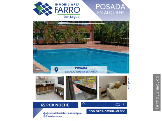 Dólares AmericanosFARRO. INMO.CO ALQUILA APARTAMENTO en el Estado Nueva Esparta, dispone de amplia habitacion que incluye una cama queen y en la sala 1 sofacama matrimonial, se encuentran completamente equipado, con capacidad para 4 personas. Ademas ofrece una amplia piscina para el disfrute de la familia y se encuentra a tan solo 5 minutos de playa El Agua.