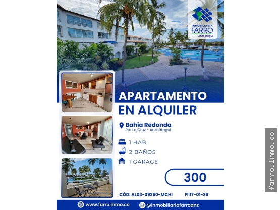 *ALQUILER* fijo o vacacional de cómodo apartamento sitiado en conjunto residencial Bahía Redonda, de 83Mts2, completamente amoblado, consta de una (01) habitacion , dos (02) baños , area de sala-comedor, cocina con tope de granito completamente equipada, cuenta con sofá cama en la sala, servicio de Internet, 1 er piso, ascensor, amplia terraza con una espectacular vista al mar Capacidad 2-3 personas