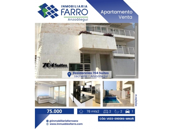 VENDE Hermoso Apartamento ubicado en Residencias 704 SUITES, Sector Morro III, con una superficie de 78 m2, distribuidos en: una Habitación principal con baño y vestier, una habitación, un baño común, sala, cocina moderna, empotrada y equipada, área de lavado, un balcon con hermosa vista. 01 puesto de estacionamiento.