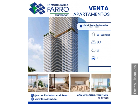 VENDE Apartamentos Jem Private Residencies Miami, Una nueva torre residencial y de multi uso en el nuevo Miami World Center se encuentra en Pre-construcción por el prestigioso constructor de New York, Naftali Group, con 69 pisos y 278 unidades residenciales,Variedad de Unidades: El proyecto ofrece una amplia gama de opciones, incluyendo Tipo Estudio, apartamentos de 1, 2 y 3 habitaciones, la distribución de las unidades varían en tamaño, desde aproximadamente 52 m² a 222 m²· sin contar las terrazas, Vistas Panorámicas, todos los apartamentos están diseñados para maximizar las vistas imponentes de la Bahía de Biscayne, el Océano Atlántico y el vibrante skyline de Miami, Pisos de tablones de roble blanco en todas las residencias,techos altos que amplían el espacio visual.Ventanas de impacto de piso a techo, Cocinas Gourmet Gabinetes Italianos, Encimeras de Losa de Piedra Natural, Electrodomésticos de Última Generación, 1,2,y 3 Baños Tipo Spa, 1 Estacionamiento.