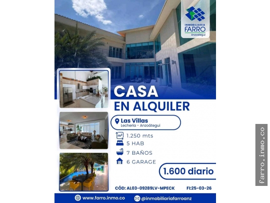 Ofrece para RENTA VACACIONAL exclusiva casa ubicada en el Conjunto Residencial LAS VILLAS.