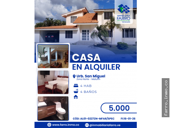 SE ALQUILA CASA EN URB. SAN MIGUEL AL01-0227ZN-MFAR/SPEC