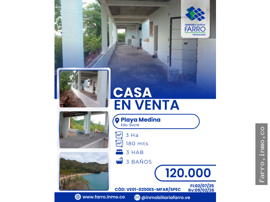 Dólares AmericanosFARRO.INMO.CO VENDE casa con bienhechurías ubicada en la icónica Playa Medina, estado Sucre, Venezuela, una propiedad única que combina naturaleza, exclusividad y vistas privilegiadas al Mar de las Antillas.