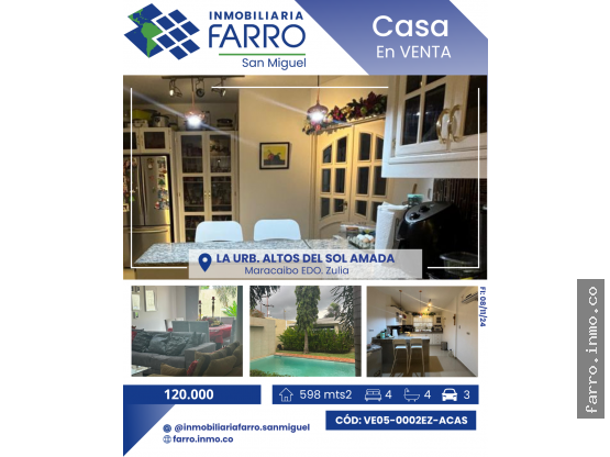 *FARRO.INMO.CO VENDE* Hermosa Casa-Quinta ubicada en La Urb. Altos del Sol Amada 1era etapa, Vía al aeropuerto de 598 mt2 de terreno y 185,4 mts de construcción; esta espectacular propiedad posee; Áreas Sociales con una hermosa Piscina y un espectacular jardín con plantas ornamentales.