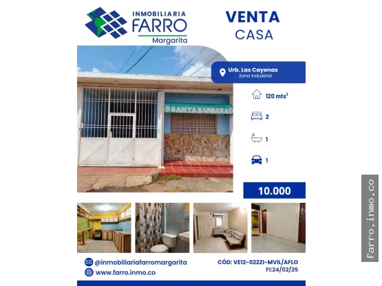 FARRO.INMO.CO VENDE casa ubicada en la Urb. Las Cayenas, zona industrial con 120 mts² de terreno y construcción, distribuido en 2 Habitaciones, 1 baño, 1 local, 1 puesto de estacionamiento, cocina tradicional, sala, techo de placa, piso de cerámica.