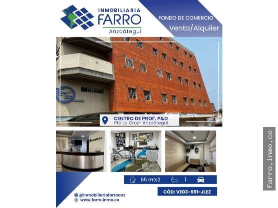 Ofrece EN VENTA O ALQUILER Fondo de Comercio de Clinica Odontológica en la ciudad de Puerto La Cruz en el Centro de Profesionales P&D piso 1, (Al lado de Centro Médico Total) tiene una superficie aproximada de 65m² distribuidos de la siguiente manera: 3 Consultorios (1 muy amplio) 1 Baño, Cuarto de rayos X, Área de Laboratorio, Área de recepción, caja y Sala de espera.