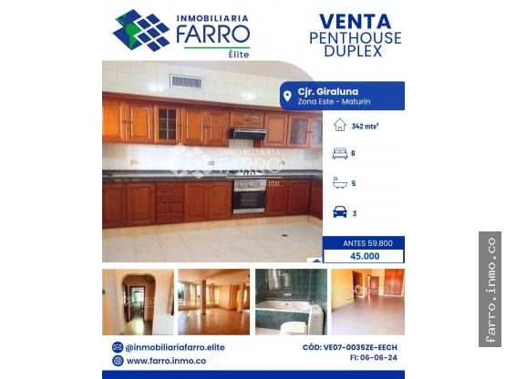Dólares AmericanosFARRO.INMO.CO VENDE: Espectacular, bello y muy espacioso Apartamento: PENTHOUSE DUPLEX, con excelentes acabados. Ubicado en la urbanización Juanico, Zona Este; el cual se encuentra dentro del Conjunto Residencial GiraLuna. Cuenta con una superficie de 342mts². Formado por 2 niveles, de 6 habitaciones, 5 baños.