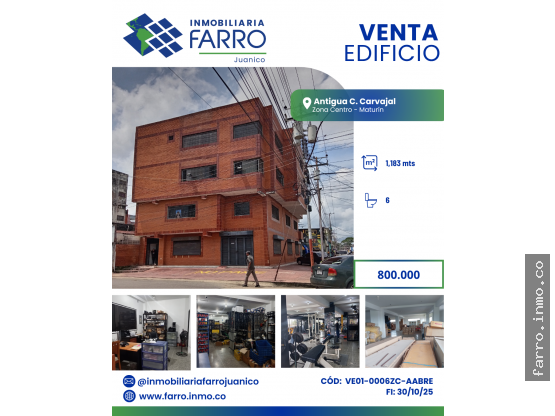 Dólares AmericanosFARRO.INMO.CO VENDE Edificio ubicado en el centro de Maturín antigua calle Carvajal, con antigua calle arriojas. El mismo cuenta con Área de terreno 428,52mts² y una construcción: 1,183m² distribuidos en 4 niveles, totalmemte terminado con pisos en granito pulido, 6baños, ventanas de aluminio, tanque subterráneo con 2 hidroneumático.