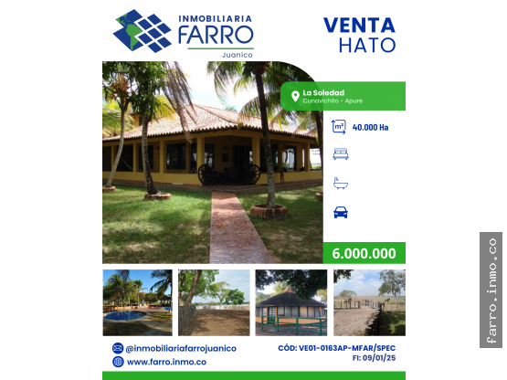 FARRO.INMO.CO VENDE HATO en Apure de  40 mil hectáreas en 6 millones de dólares (6.000.000 $) con las siguientes características :