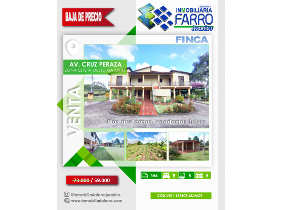 Dólares AmericanosINMUEBLESFARRO.COM VENDE Hermosa Finca con Casa Campestre, ubicada en la Av. Cruz Peraza, Maturín. La cual consta de 3 HA con 2712 mts2 de terreno y 948 mts2 de construcción, Distribuidas en una acogedora casa con piso de Granito, cocina empotrada con tope de granito y pisos externos de caico, la cuál está distribuida en 4 habitaciones , 3 baños y 1/2, 1 área de estudio, en el segundo nivel posee 2 apartamentos de 150 mts2 cada uno, con piso de porcelanato y techo de machihembrado los cuales constan de 3 habitaciones y 2 baños y 1/2. Cuenta con 2 tanques de agua elevados, cuenta con su propio Pozo de agua, Simple Tv, 10 puestos de estacionamiento techado. En el área externa de la casa cuenta con 2 depósitos de herramientas con su baño, 1 oficina, 1 habitación de servicio, Área de comedor, completamente cercada con su cerco y portón eléctrico, Cámara de seguridad, árboles frutales, Un sistema de riego por gravedad y por aspersión. Con un excelente ambiente natural.