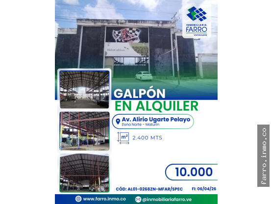FARR.INMO.CO presenta este espectacular galpón de 2400 m² totalmente techado, ubicado estratégicamente en la Av. Alirio Ugarte Pelayo. El espacio perfecto para grandes centros de distribución.
