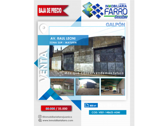 Dólares AmericanosINMUEBLESFARRO.COM: VENDE Galpón con una superficie de terreno de 800mts² aproximadamente, con paredones de 6 metros de altura en concreto armado, dicha estructura en general cuenta con fundaciones de 1,20 de ancho con cabillas de 1", Techo de Zinc Acanalado que cubre hasta 600mts² aproximadamente. Adicionalmente posee una estructura interna con fundaciones para soportar 3 pisos (diseños y planos para un edificio residencial ya que al frente está el Pedagógico Experimental de Maturín). Posee las instalaciones sanitarias, tuberías de aguas blancas y aguas negras de 10". En el mismo han funcionado negocios tales como: Patio de Maquinarias Pesadas, Espacio Funcional para Gallera y Cría de Gallinas, Taller Mecánico. Ubicado Avenida Raúl Leoni, Vía El Sur, a pie de calle, ubicación en zona comercial, al lado tiene Supermercado Chino cómo punto de referencia, a 100 mts del Centro Comercial Híper Líder antiguamente conocido cómo Sigo y seguidamente Centro Comercial La Cascada cómo uno de los principales centros comerciales de la zona Sur de Maturín.