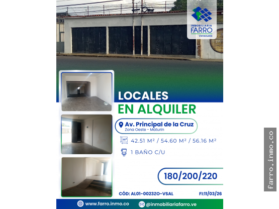 FARRO.INMO.CO ALQUILA 3 locales comerciales con piso de granito , techo de platabanda total seguridad, a pie de calle, ¡excelente ubicación en la Av. Principal del sector La Cruz, Maturín