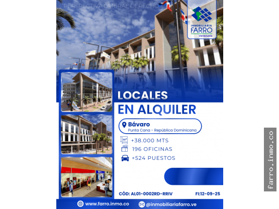 FARRO.INMO.CO OFRECE Centro Empresarial turístico con modernas instalaciones en la zona de mayor desarrollo de Bavaro Punta Cana. Con el primer nivel comercial únicamente disponible para alquiler. Un segundo destinado solamente al sector salud y tres para oficinas ideales para potenciar su negocio como empresario o inversionista. 1. LOCAL. COMERCIAL. 38,0mts2.  2 LOCALES. COMERCIAL. 42,3 mts2.  1 LOCAL. COMERCIAL. 46,0 mts2.  3. LOCALES. COMERCIAL. 47,2mts2.  1. LOCAL. COMERCIAL. 210,0mts2.  1. LOCAL. COMERCIAL. 222,0mts2.