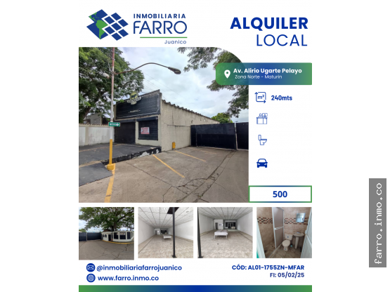 FARRO.INMO.CO ALQUILA Local de 240 M2 ubicado en las Av. Alirio Ugarte Pelayo de Maturín - Estado Monagas que consta de Santa, piso de cerámica, techo raso y 2 baños