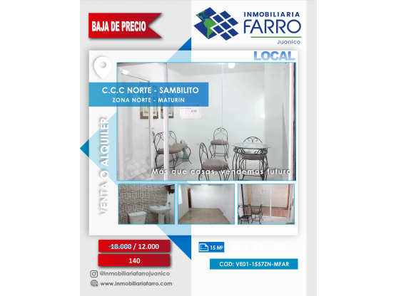 INMUEBLESFARRO.COM: VENDE/ALQUILA Local en C.C.C Norte (Sambilito). Ubicado en Planta Baja. Mide 15mtrs², Puerta de Vidrio en el frente con Cerradura, Santa María con Candados, 2 Lámparas, 1Suiches de prender la Luz, 4 Enchufes, Tablero /Luz 110 y 220, Piso de Cerámica, Paredes empastadas y pintadas, Agua, Baño con: Puerta, 1 Poceta con Tanque, 1 Lavamanos con Pedestal. Listo para firmar.