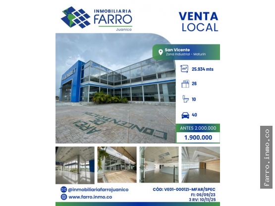Dólares AmericanosFARRO.INMO.CO: vende amplio local en la vía que conduce de MATURIN a Barcelona al lado de la zona Industrial de MATURIN Estado Monagas frente a la población de San Vicente con las siguientes características: 25.934 M2 de terreno,5.700 M2 de construcción, edificio de Dos plantas de oficinas de administración y departamento de ventas en planta baja y Mezzanina con acabados de primera que incluyen piso de porcelanato y paredes frizadas, 40 puestos de estacionamiento en las áreas laterales del edificio principal, 26 puestos de trabajo, Cocina con Comedor ,Oficina presidencial con su baño interno, 2 amplias salas de conferencia, 2 Cuartos de servicio, Pozo de agua, Foza para desechos tóxicos.