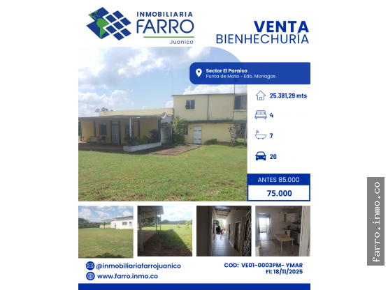 Dólares AmericanosINMO.FARRO.CO VENDE: Patio con bienhechuria ubicado en el sector el paraíso, Punta de Mata, estado Monagas. Área de terreno: 25.381,29mtr2 Área de Construcción: 378,43mt2 Consta de una Casa, un anexo de 2 niveles y un galpón. CARACTERISTICAS: CASA: área de construcción de 251,25Mtrs2, piso de cerámica, techada con acerolit y zinc acanalado. Distribución: 4 habitaciones. 4 Baños. 3 oficinas 2 depósitos 1 cocina - comedor Sala. ANEXO: área de construcción de 94,95Mtrs2, piso de cerámica y caico, techada con platabanda y acerolit. Distribución: 4 oficinas. 3 baños GALPÓN: área de construcción de 32,23Mtrs2. Estacionamiento para 20 vehículos. Adicionalmente en el área de trabajo posee espacio para estacionamiento para 60 gandolas. Casilla de vigilancia. Documentación en regla, listo para firmar.