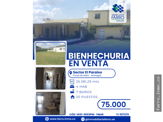 INMO.FARRO.CO VENDE: Patio con bienhechuria ubicado en el sector el paraíso, Punta de Mata, estado Monagas. Área de terreno: 25.381,29mtr2 Área de Construcción: 378,43mt2 Consta de una Casa, un anexo de 2 niveles y un galpón. CARACTERISTICAS: CASA: área de construcción de 251,25Mtrs2, piso de cerámica, techada con acerolit y zinc acanalado.  Distribución:  4 habitaciones. 4 Baños. 3 oficinas  2 depósitos 1 cocina - comedor   Sala.  ANEXO:  área de construcción de 94,95Mtrs2, piso de cerámica y caico, techada con platabanda y acerolit. Distribución: 4 oficinas. 3 baños GALPÓN:  área de construcción de 32,23Mtrs2.  Estacionamiento para 20 vehículos. Adicionalmente en el área de trabajo posee espacio para estacionamiento para 60 gandolas. Casilla de vigilancia. Documentación en regla, listo para firmar.