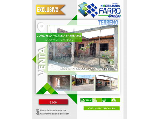 Dólares AmericanosINMUEBLESFARRO.COM VENDE: Una Parcela de terreno con bienhechurías, de 109,24 m2, ubicada en el Conjunto Residencial Victoria Paraparal (al lado del Supermercado Bio Mercado), identificada con el Nro. 31, manzana P-15, Los Guayos estado Carabobo. Sobre la parcela se encuentran unas bienhechurías inconclusas con paredes de bloques de arcilla con vigas y columnas de concreto y cabillas, con divisiones para sala -comedor, cocina, tres (3) habitaciones, un (1) baño, lavadero, todo el techo armado con tabelones y vigas doble T, fachada con dos ventanas y una puerta con rejas metálicas, además estructura con columnas y vigas de concreto y cabillas para el porche, posee puntos de toma para las conexiones de agua y electricidad, calle cerrada con portón eléctrico, fundaciones para dos niveles.